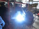 下向きI型突合せ溶接の説明後、アーク溶接機を使って溶融させています。