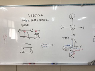今回は2か所で1つの器具を断続できる3路スイッチの実習をしました。