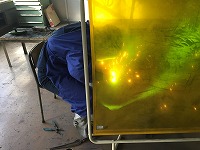 作業です。放電の光は強烈 火花の飛散を防ぎ、眩しさも