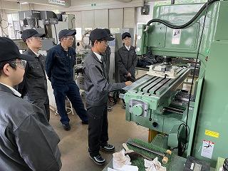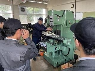 先生からフライス盤の構造の説明を受け、      では実際に削ってみましょう!
