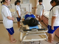 本日から3年次生は、特殊浴槽(機械浴)を使用した入浴介助の実習を行っています。