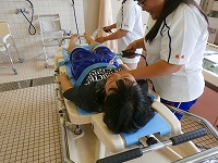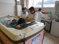 入浴介助は「蒸し風呂」もしくは「温水プール」のような気温と湿度の中での介助ですが、皆元気に頑張って実習していました。
