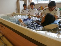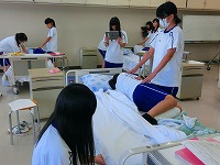 最初は、耳にお湯が入ったり、顔にかかったりと、利用者役の生徒に「ごめんなさい」と謝りながら行っていましたが、徐々に手際が良くなりました。