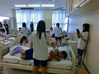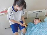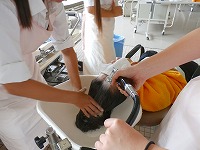 髪をベッドの上で洗うという状況になったことが今までない生徒たちは、四苦八苦しながらやっと洗髪できた感じです。