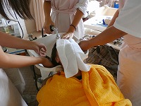 反省点はいろいろありますが、洗髪された生徒は「声がかからないので、いつお湯が髪にかけられるのか、次は何をするのか行ってほしかった」と感想を述べていました。次回はこの点を改善したいと思います。