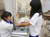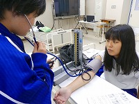 水銀の血圧計を使って初めて測定してみました。なかなか脈を聴診器で聞き取ることができず何回も挑戦していました。