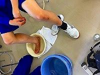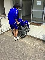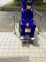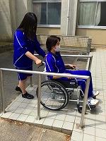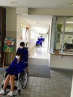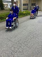 今回は、車いす移動です。学校内での実習は昨年も何度か行いましたが、校舎外での実習は数少なく、路面の凹凸が乗車している体に響くことや、やや斜めに路面が施工してある場所では誘導に苦戦していました。