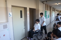 その後、教室や廊下、トイレなどで実際に介助者役、利用者役に分かれ体験し、正しい介助方法を身につけました。