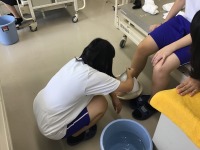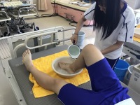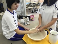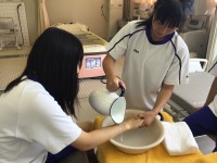 3年生の生活支援技術で「手浴・足浴」の介助練習をしました。座位での介助・臥位での介助の2パターンを実践し、お湯の温度や洗い残しがないこと等に配慮しながら行うことができました。