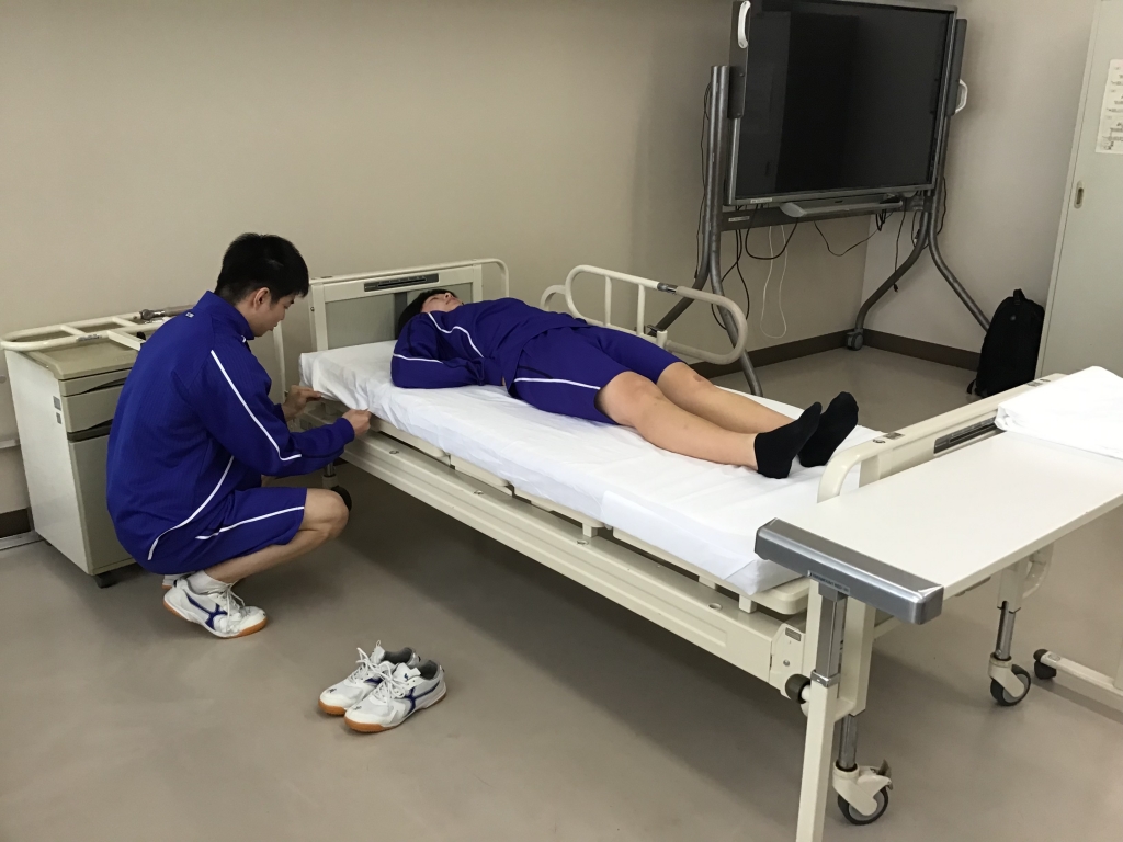 今年最後の実技の授業では基本のベッドメイキングに加え、利用者さんが寝ている状態でのベッドメイキングを行いました。