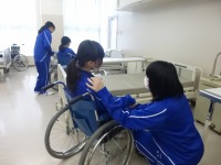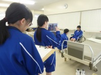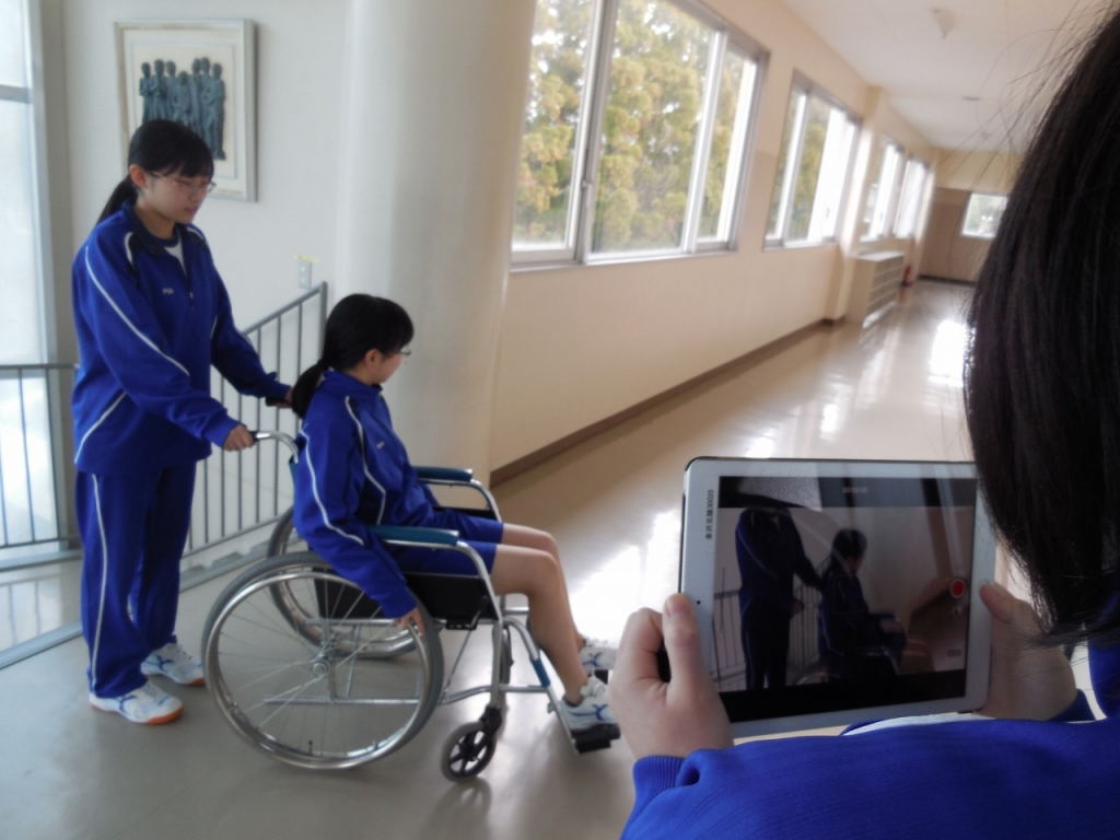 生徒が、片麻痺のある高齢者役・介護者役・評価する人・アイパッドで撮影する人を決め、介護技術の確認をしました。