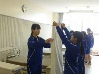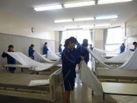 実技の際の身だしなみ、持ち物の確認後、演習と、シーツの畳み方を習いました。