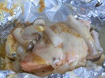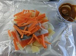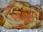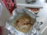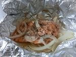鮭のホイル焼きの実習です。玉ねぎを敷いて鮭、しめじをのせました。