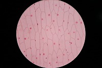 タマネギの表皮細胞。染色すると核が赤く染まっているのが分かります。