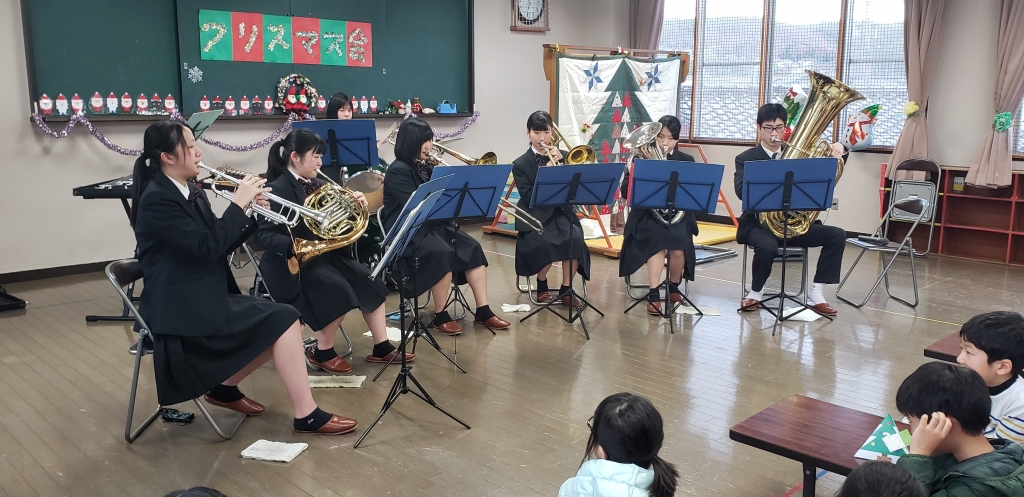 「クリスマスメドレー」、「マリーゴールド」、「無責任ヒーロー」など子どもたちが知っていそうな曲を中心に演奏をしました。特に「パプリカ」の演奏では子どもたちが歌ったり、踊ったりしてくれたので、和やか雰囲気の中演奏することができました。