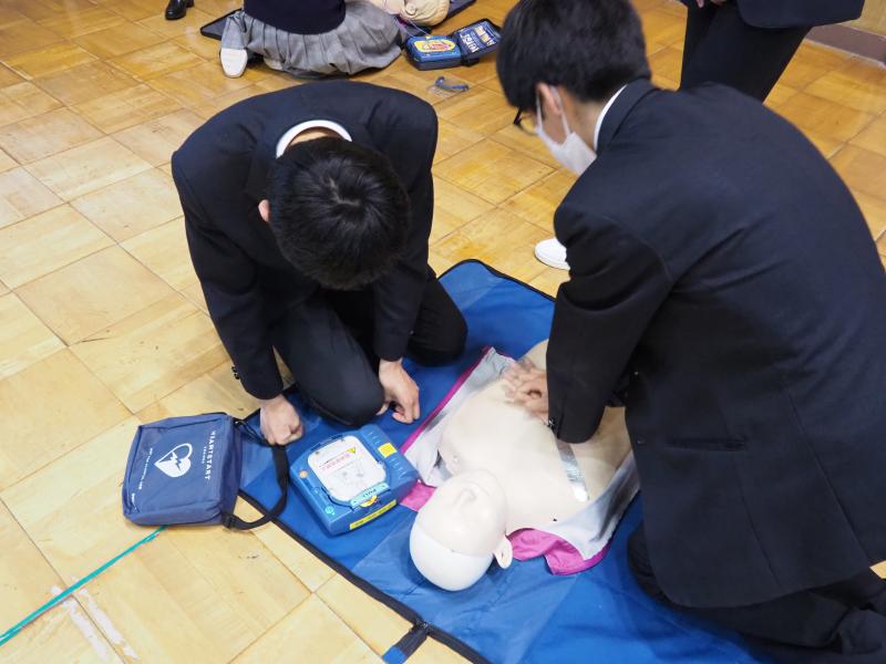 びました。また、後半は救急救命法についてです。心肺蘇生法、AEDの使用法について学んできました。