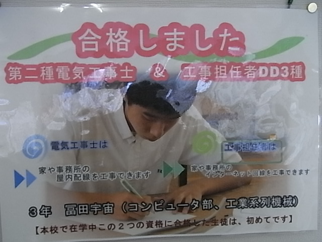 西野翔吾君(2年サッカー部、コンピュータ部)が、昨年度に続き「第一種電気工事士」と