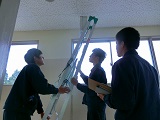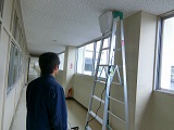 養生テープで機器をはり付け 現場へAPをつけた梯子を移動 設置予定箇所にAPを仮設置