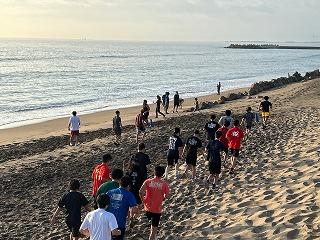 早朝練習では砂浜で走り込みをして足腰を鍛える!