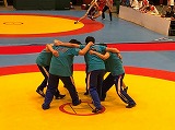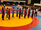 マット4面を埋め尽くす参加選手。 試合前の挨拶。 チームで檄を飛ばす!