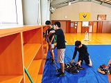 技術指導をする卒業生。 練習後は棚やマットの清掃。