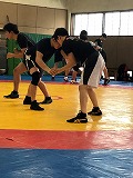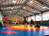 マット2面での練習。 岐阜の選手と練習をする船曳。