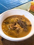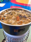 じっくりと煮込んで出汁をとり、具たくさんの味噌仕立ての鍋です。お代わりをする部員もおり、あっという間に完食しました。手羽元、人参、玉ねぎを10時間かけて煮込みスープが完成。味噌、えのき、しめじ、白菜、蒟蒻、鶏モモを入れて完成。