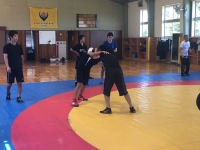 相手の隙を探る米林。 自分より25kg以上重い選手に挑む船曳。