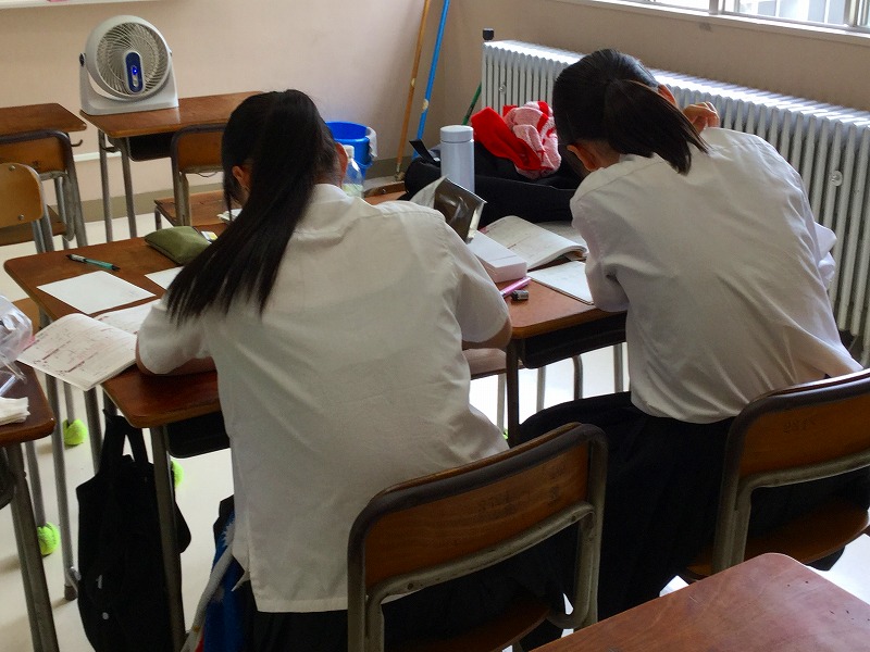 30℃を超える教室の中、楽しく学習会をしました。期末テストに向け、頑張っています。