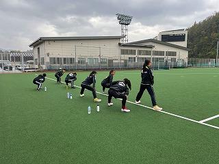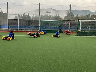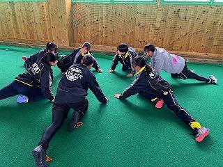 練習前のメンタルトレーニング、ストレッチ、サイキングアップなど普段丹生高校が行っている練習を
