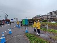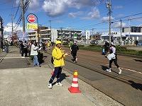走路ボランティアは「沿道整理員」「表示看板員」「横断誘導員」「トイレ誘導員」などに役割分担し、歩行者や沿道で応援する方々の整理ならびにランナーの誘導・案内を行いました。途中、体調不良のランナーが発生した際には、市職員や陸協審判員と連携し救助にあたりました。