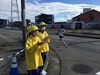 続いて「表示看板員」と「横断誘導員」です。レースの大部分の時間では歩行者が横断歩道を通行できないので、丁寧に伝え迂回路を案内します。レース終盤、ランナーが少なくなってきたタイミングで適宜横断の指示を行います。表示看板員は55区にて24km地点の看板を持ち、声援ともにランナーへ周知をしました。