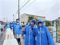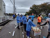 給水ボランティアは、今年度スポーツドリンク3島を担当しました。次々に通過するランナーの皆さんにドリンクを提供できるよう、コップに注ぎ続けます。先頭の島では、トラメガをもって常に給水の案内や応援の声掛けをします。ランナーの方にも好評で、反対に励ましやお褒めの言葉をいただきました。さらに新設されたかぶり水ゾーンも担当しました。ランナーの方が柄杓でかぶり水ができるよう補充をしました。