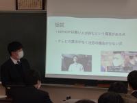 (2年)自分が来年、何についてテーマ研究をしていくかののヒントになったので良かった。どの発表も結論が明確で、説得力のある内容だったのでとても分かりやすかった。どの研究も初めて知ることばかりで、今後役に立つこともあるだろうと思うので、今回の話を忘れないようにしていきたい。スライドもとても見やすく、頭にはいりやすかった。発表者の良いところを自分もまねをしてできるようになりたい。