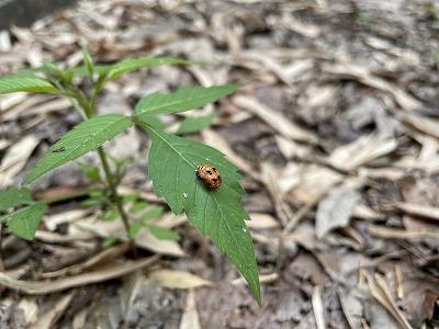 実習棟の草(葉っぱ)の上に、なにか赤いものが乗っているようです