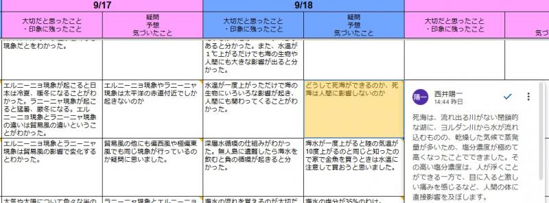 地学基礎の授業では、毎回の授業の終わりにスプレッドシートを用いた振り返りを「ポートフォリオ」に記入しています。