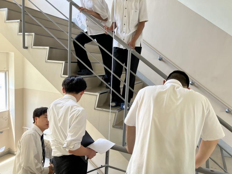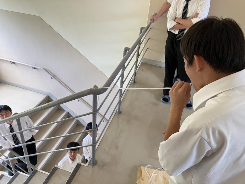 今回、生徒たちは校舎の3階から1階に置いたジュースを、なんと9.5mの透明チューブを使って飲むという実験を実施!