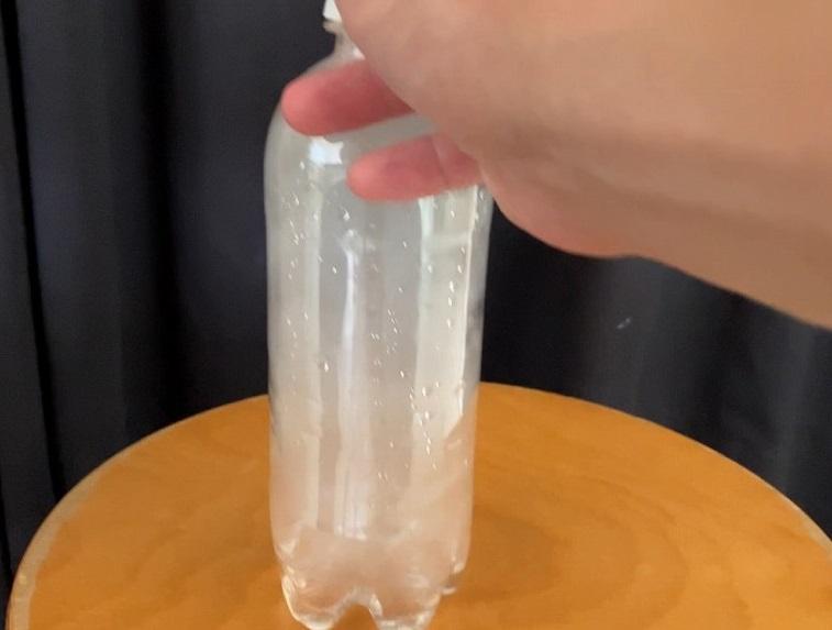 そのあと冷水で一気に冷やすと、ボゴッ!という音とともにペットボトルがぺしゃんこに!