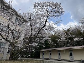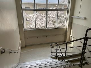 教室棟3階、階段に来ると・・・おっ、中庭の 部活動長屋前の桜です。部活動の準備がてら