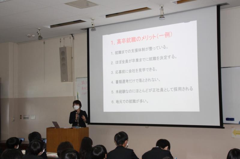 高校生で就職することのメリット・デメリットや、どんな人材が必要とされているのか、必要な最低限のマナーなどを、演習を交えながらご指導いただきました。