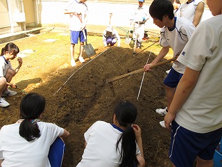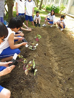 植え付けて        学務員の方に協力していただいて完成です。これから手入れをして秋の収穫が楽しみです。