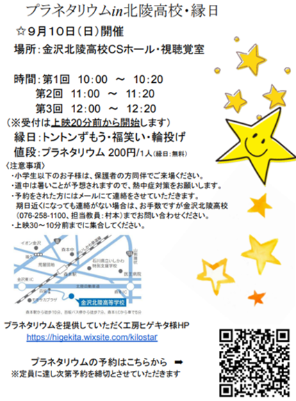 3年テーマ研究の授業で、森本地区活性化をテーマに活動を行っているグループが運営するイベント「プラネタリウムin北陵・縁日」を9/10(日)に本校で開催します。手作りプラネタリウムで全国をまわっている『工房ヒゲキタ』さんが来てくれます!!