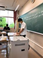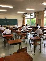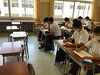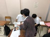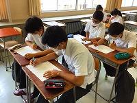 21日(金)3年生夏季補習後半最終日です。後半5日間の「国語」補習におけるテーマは「要約」、特に「意見・主張を捉える」ことに重点を置き、取り組みました。最終日はペア学習で筆者の意見を読み取ります。ペアワークの中で「なんで?」「そこ?」といったやりとり、他のペアに意見を求めるなどの様子が見られました。教師の説明には「わからん」を連発するT君も他のペアの説明に「なるほど、すっげー」と納得していました。