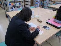 図書委員のカウンター当番さんが、新1年生用の貸出カードを作っている様子です。
