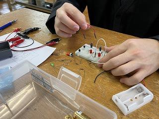 工業系列3年生 実習の授業で「ブレッドボード」による回路づくりを