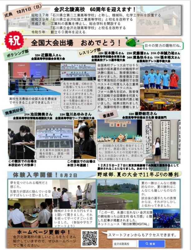 今回は、進路情報、北陵祭の様子、新人大会・北信越大会などの部活動及び各コンテストの結果を特集しております。