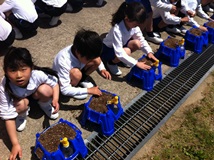 連休明けの気持ちの良い朝、1年生は朝顔の種をまきました。ふかふかの土に5つの穴を開け、朝顔の種を一粒ずつ入れました。そっと土をかけたあとは、やさしく水をあげました。芽が出る日が楽しみです。