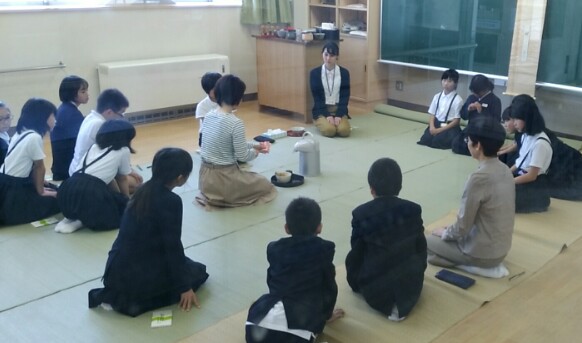 (外部講師 茶道クラブ 抹茶の点て方を教わっています。)