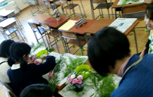 (外部講師 生け花クラブ 小さな器にピンクの花を生けています。)