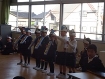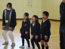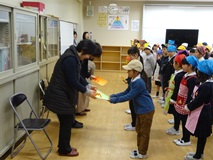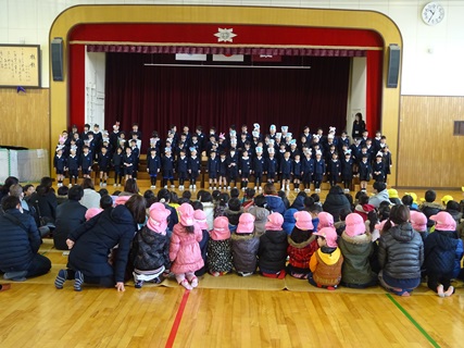 3限目に年長さんを迎える会がありました。1年生は、6年生を送る会で発表した「おむすびころりん」の劇を発表しました。とても元気が良かったです。劇の発表の後、年長さんといっしょにゲームをして楽しみました。最初は、同じ保育園の友達とかたまっていた年長さん達も少しずつ、友達の輪を広げていきました。